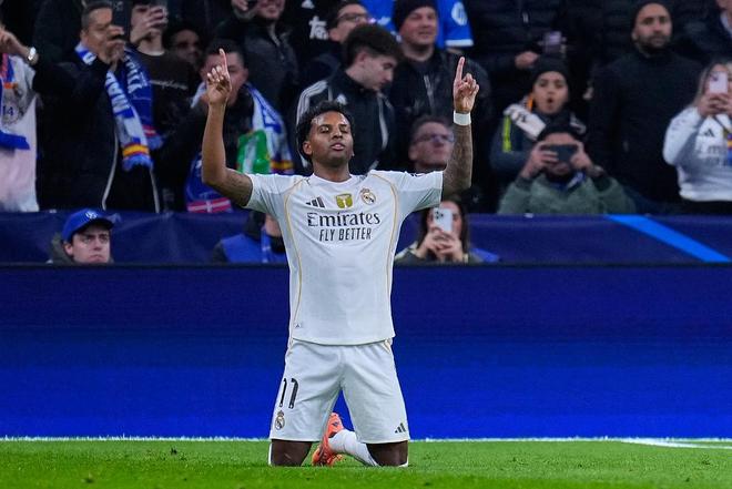 失去了姆巴佩,罗德里戈临危受命,他与维尼修斯、贡萨洛-加西亚组成了皇马的前场三叉戟,并且为球队先拔头筹。第28分钟,接贝林厄姆中路分球,罗德里戈杀入禁区在角度并不大的情况下射远角得手,1比0。